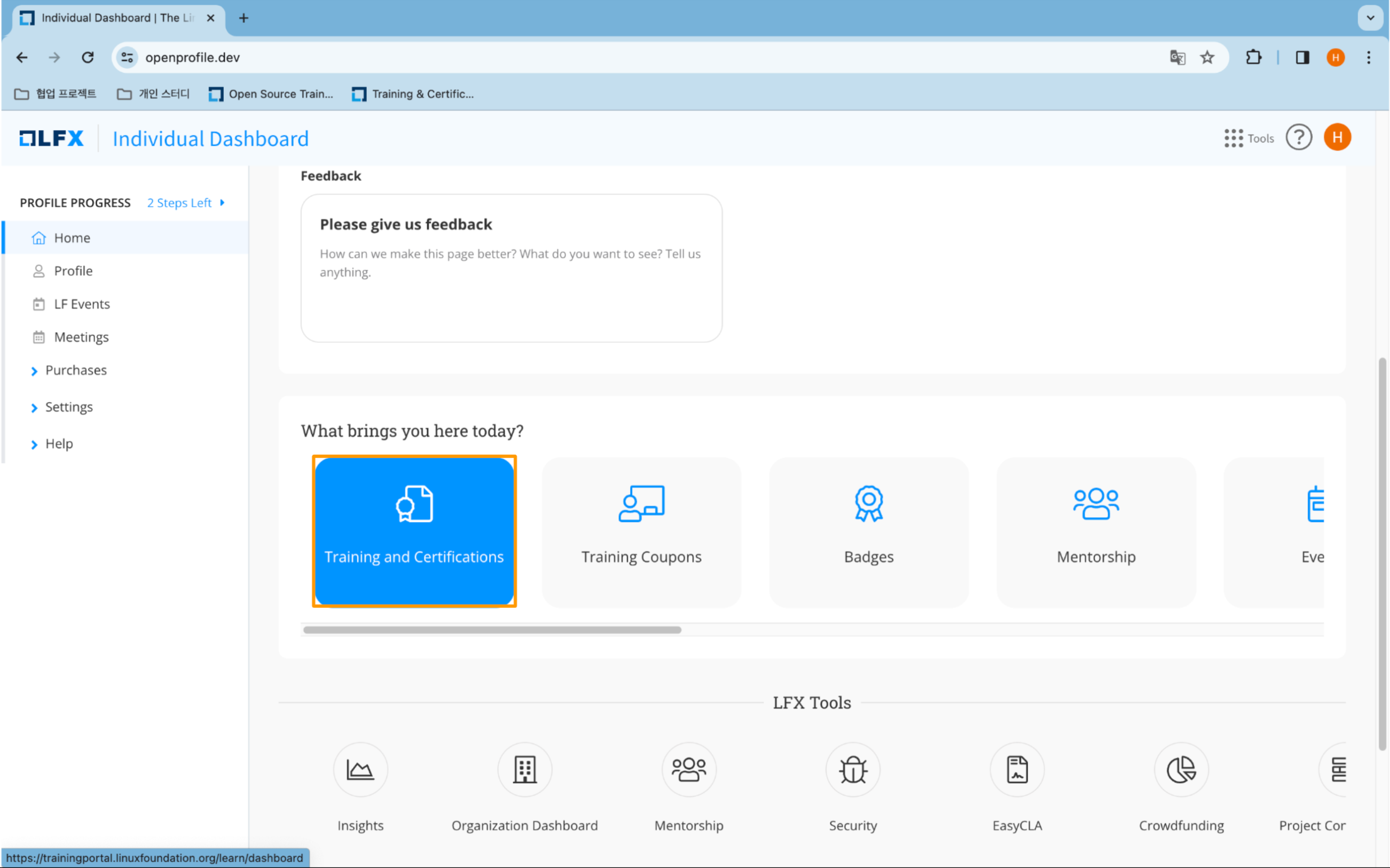 그러면 아래와 같이 새로운 페이지로 이동하는데 살짝 아래로 드래그해 보면 Training and Cetifications라는 아이콘이 보입니다. 이를 클릭해 보면 CKA 시험을 예약할 수 있습니다.