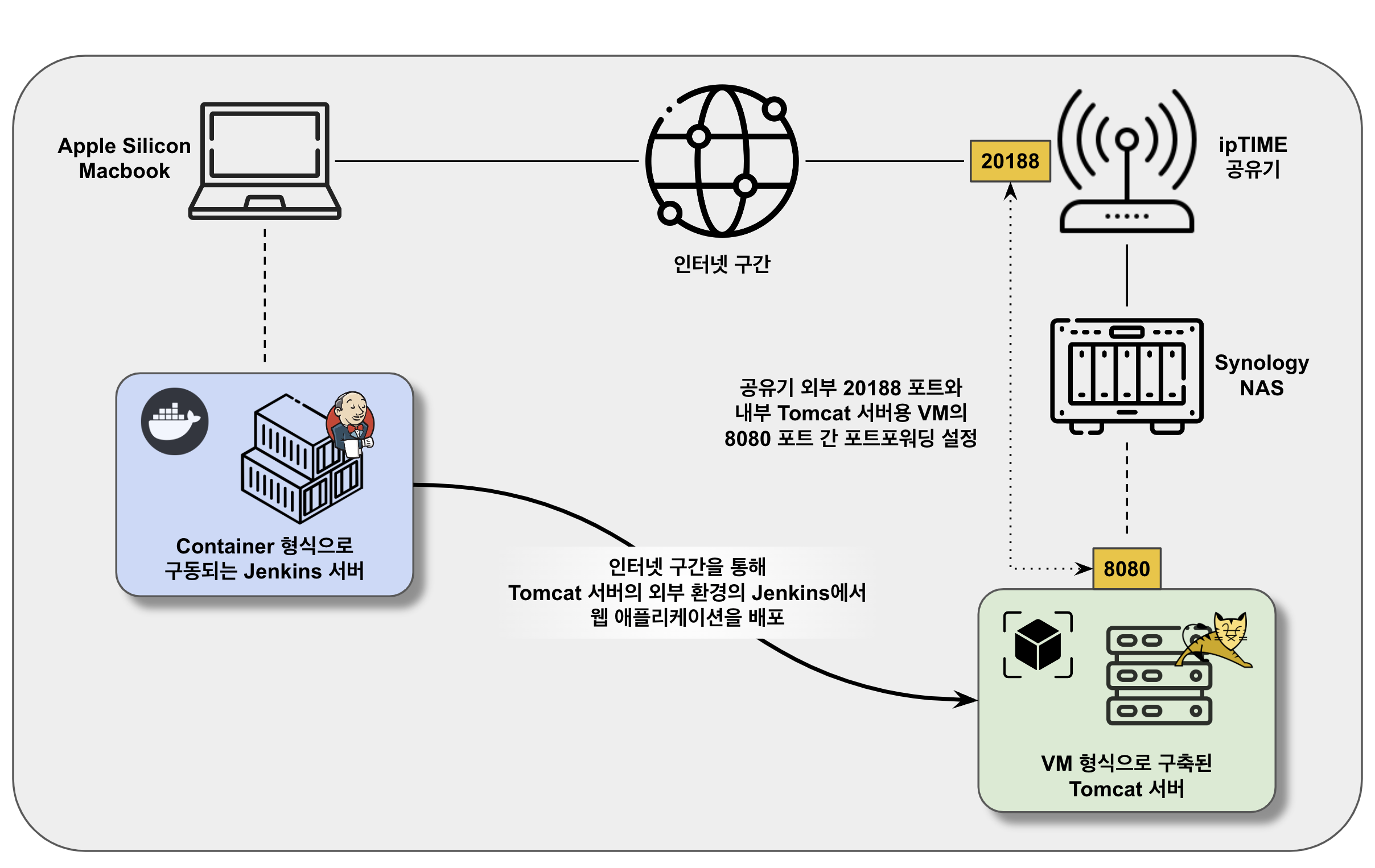 지난 포스팅에서도 말씀드렸지만, CI/CD 학습에 필요한 실습 환경을 구성하기 위해 Tomcat 서버를 구축하게 되었습니다. 제가 듣고 있는 강의에서는 로컬 환경에 Docker를 사용하여 컨테이너 형태로 Jenkins 서버와 Tomcat 서버를 구동하고 웹 애플리케이션을 배포해 보는 정도로 실습을 진행하고 있습니다. 그러나 제가 가진 장비들을 활용하여 Jenkins 서버와 Tomcat 서버를 분리하여 구축한다면 좀 더 의미 있는 실습이 될 것 같아 아래와 같은 구조로 실습 환경을 구성해 보려고 합니다.