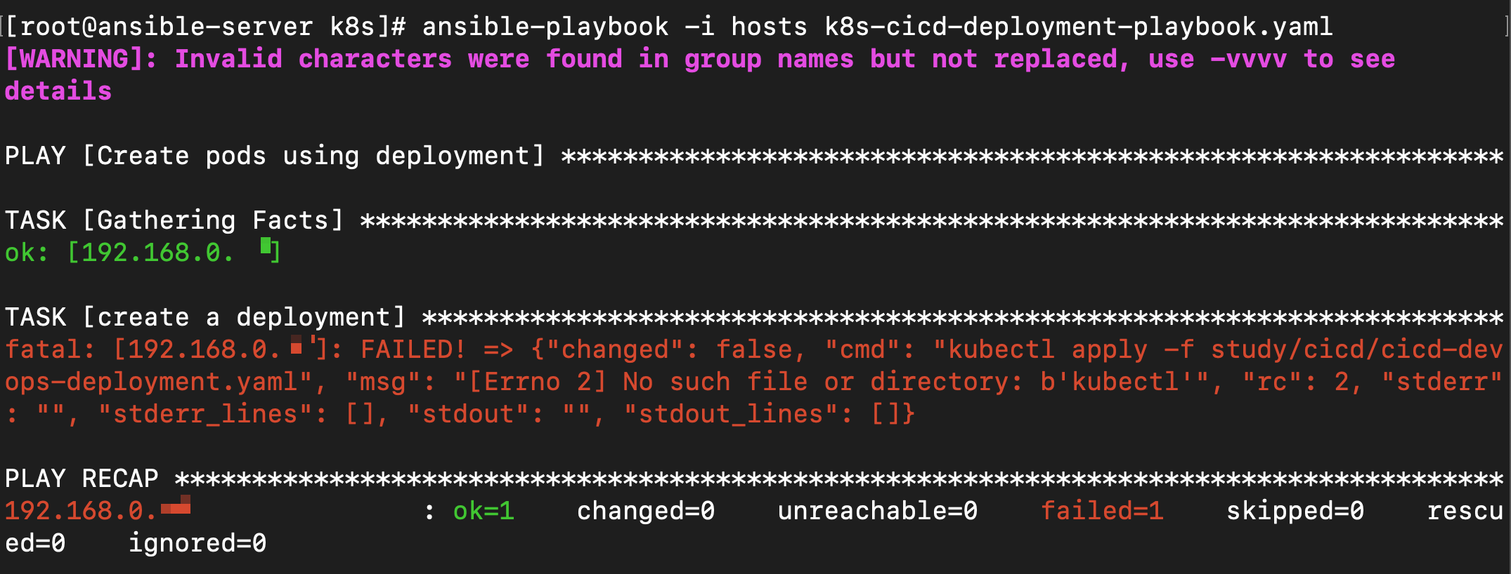 [root@ansible-server k8s]# ansible-playbook -i hosts k8s-cicd-deployment-playbook.yaml [WARNING]: Invalid characters were found in group names but not replaced, use -vvvv to see details
