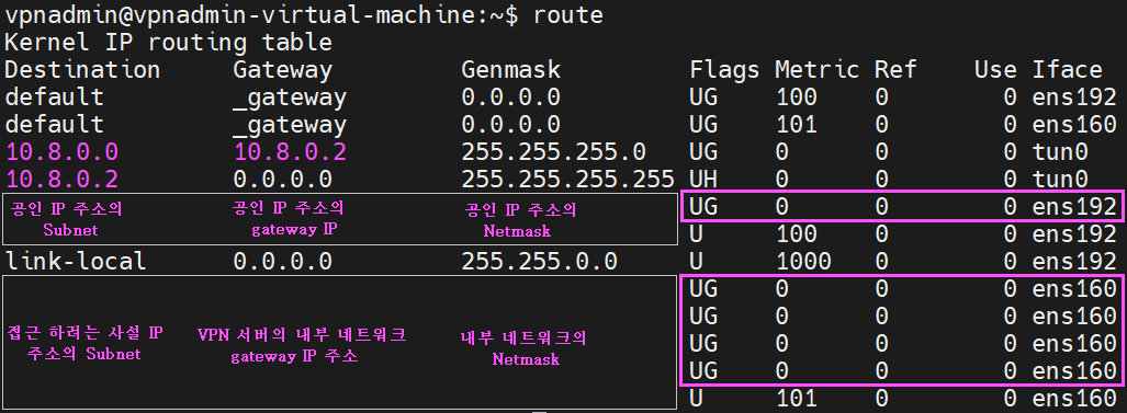 - 인프라용 사설 IP : VPN Server와 CA Server에 각각 인프라용 사설 IP를 할당했습니다. 당연하게도, 이 IP를 통해 내부망에서 해당 서버에 SSH 등을 통해 접근하여 구축 작업을 진행하였습니다. 위 그림에 파란색 선으로 표시된 네트워크입니다. 해당 네트워크는 인터넷이 가능해야 합니다.
