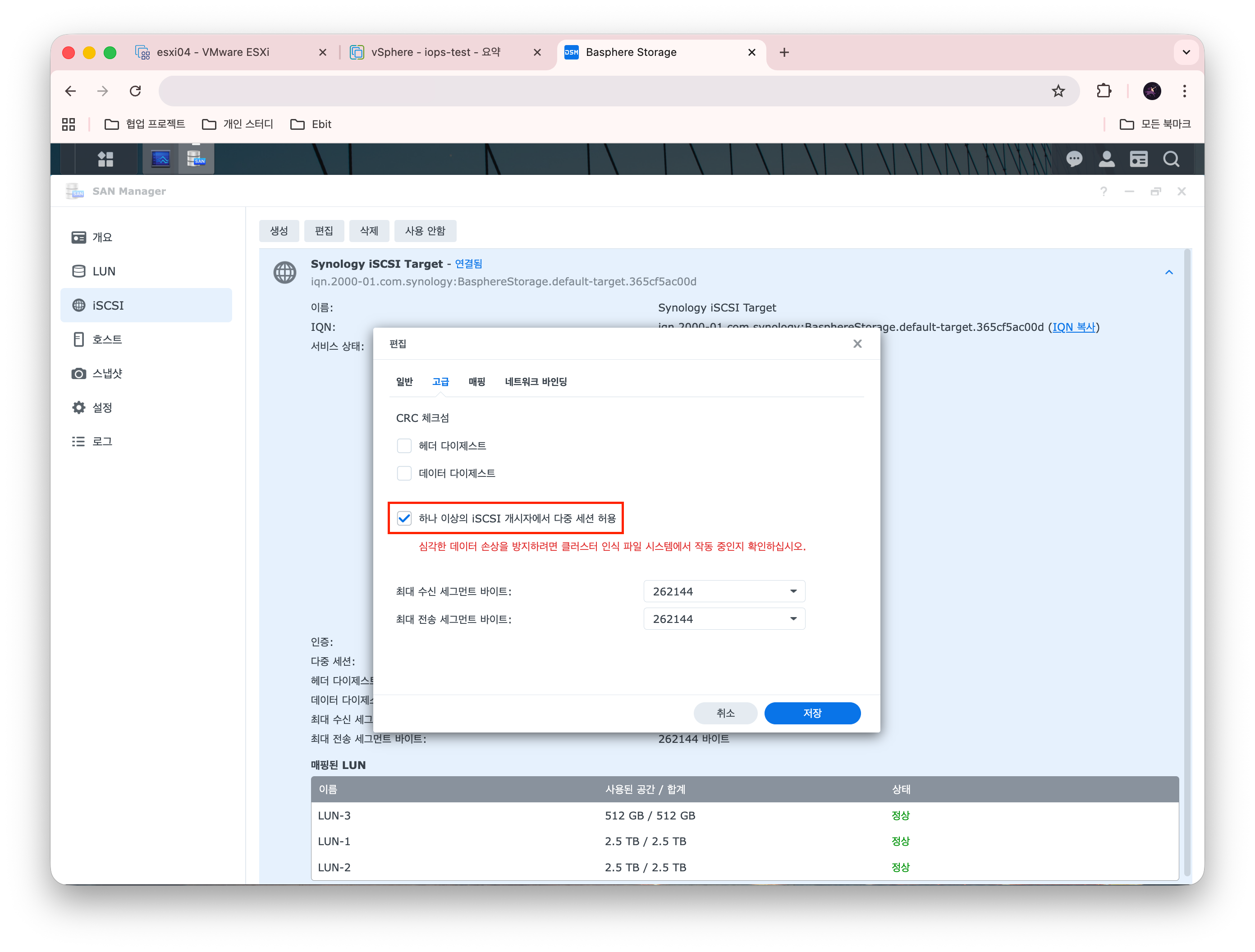 | [비교군 1] MPIO 기본 설정 | 가장 최근에 사용됨(VMware) | 버퍼링된 I/O | ESXi 호스트가 iSCSI 타겟에 대한 다중 경로만 인식하고 있는 상태 |
