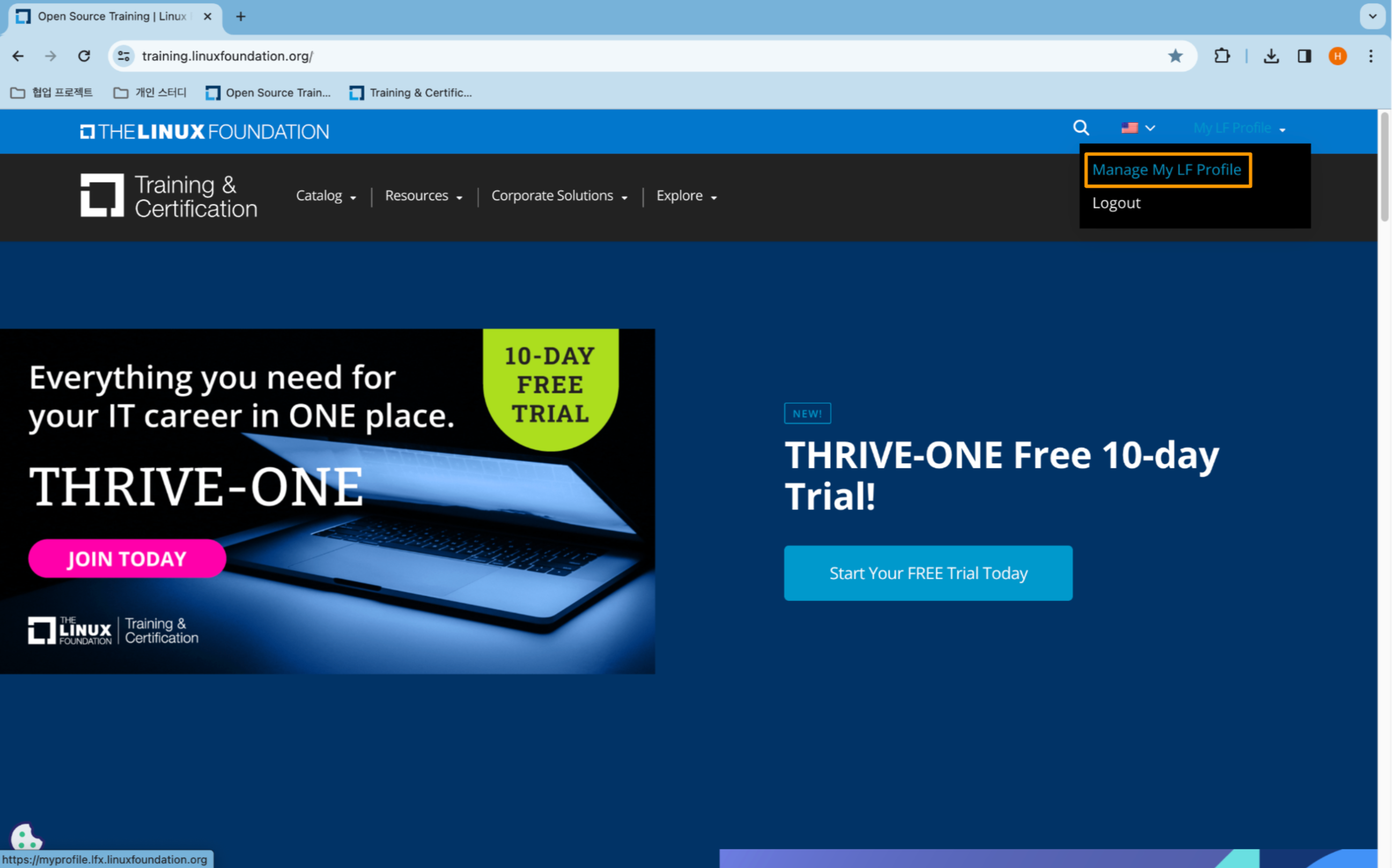 실제 시험을 치르기 위해서는 시험을 예약해야 합니다. Linux Foundation에 접속하여 우측 상단의 My Profile을 클릭합니다.