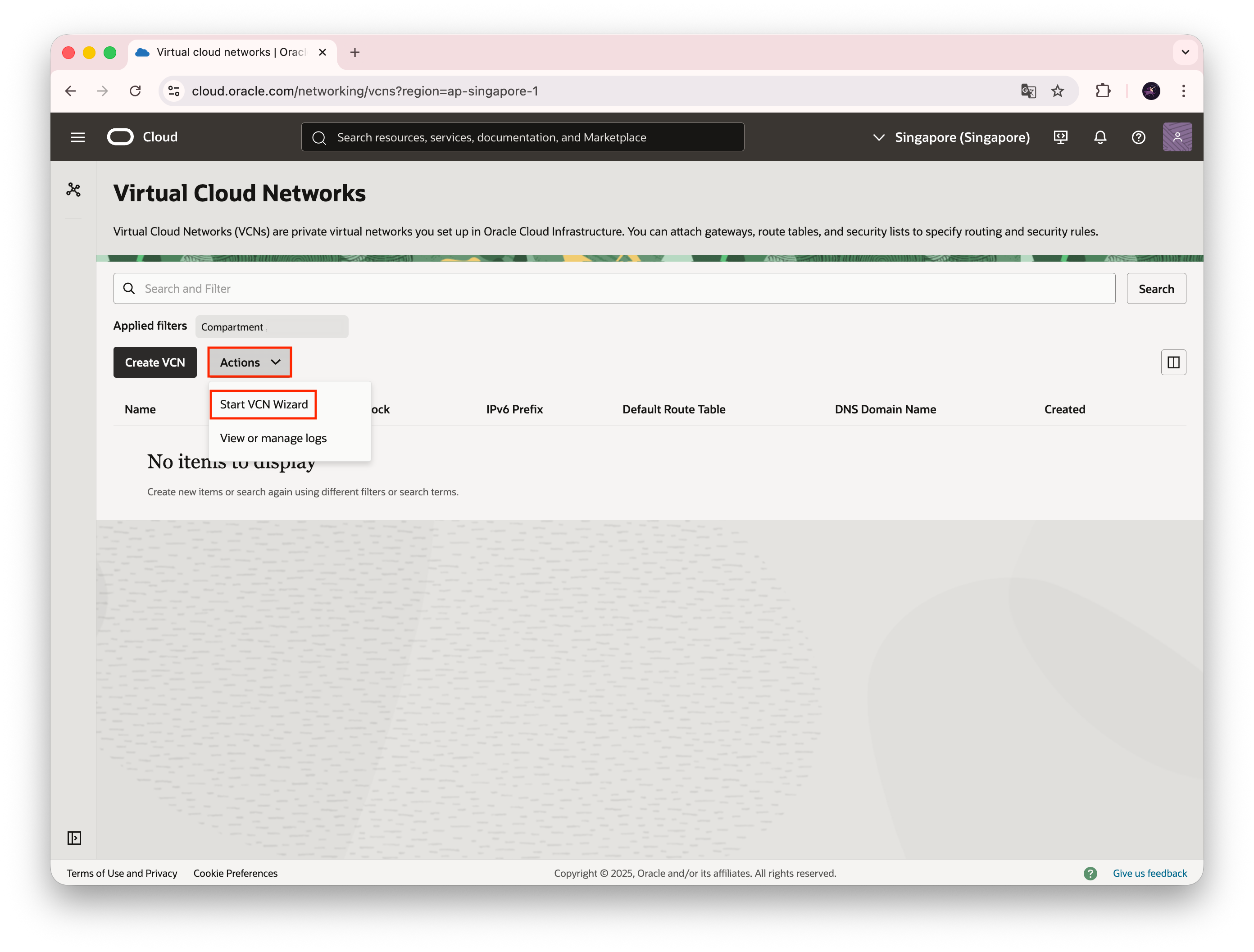 먼저 OCI 측에 VCN(Virtual Cloud Network, AWS의 VPC와 동일한 개념)를 하나 생성해야 합니다. OCI 웹 콘솔에서 Networking > Virtual cloud networks > Actions > Start VCN Wizard을 선택합니다.